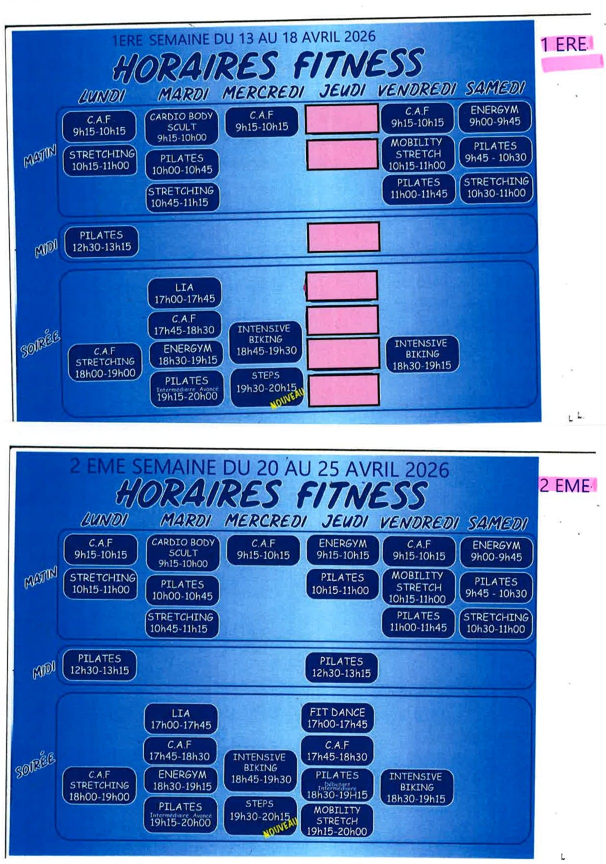 Planning Fitness Vacances d’Avril